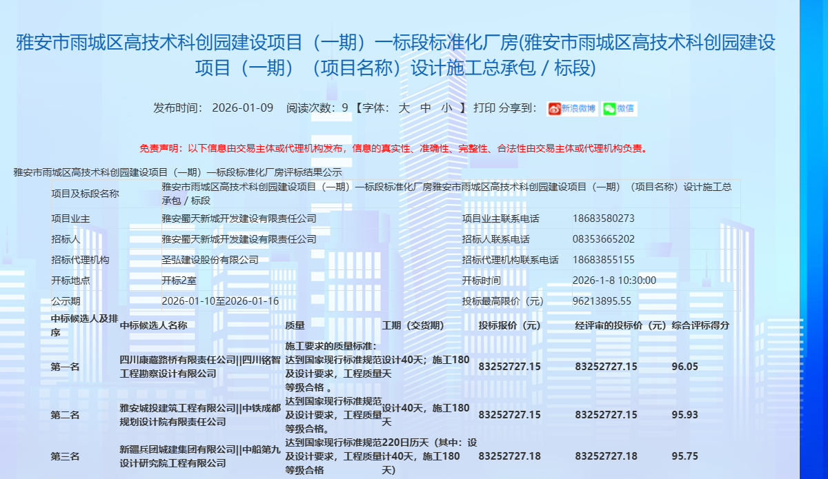 蓄勢突破,奮楫開新?挡芈窐蚬境晒孬@雅安市雨城區(qū)高技術科創(chuàng)園建設項目(一期)一標段標準化廠房項目,中標金額8325.27萬元,為公司2026年發(fā)展強勢開篇,迎來馬年“開門紅”。