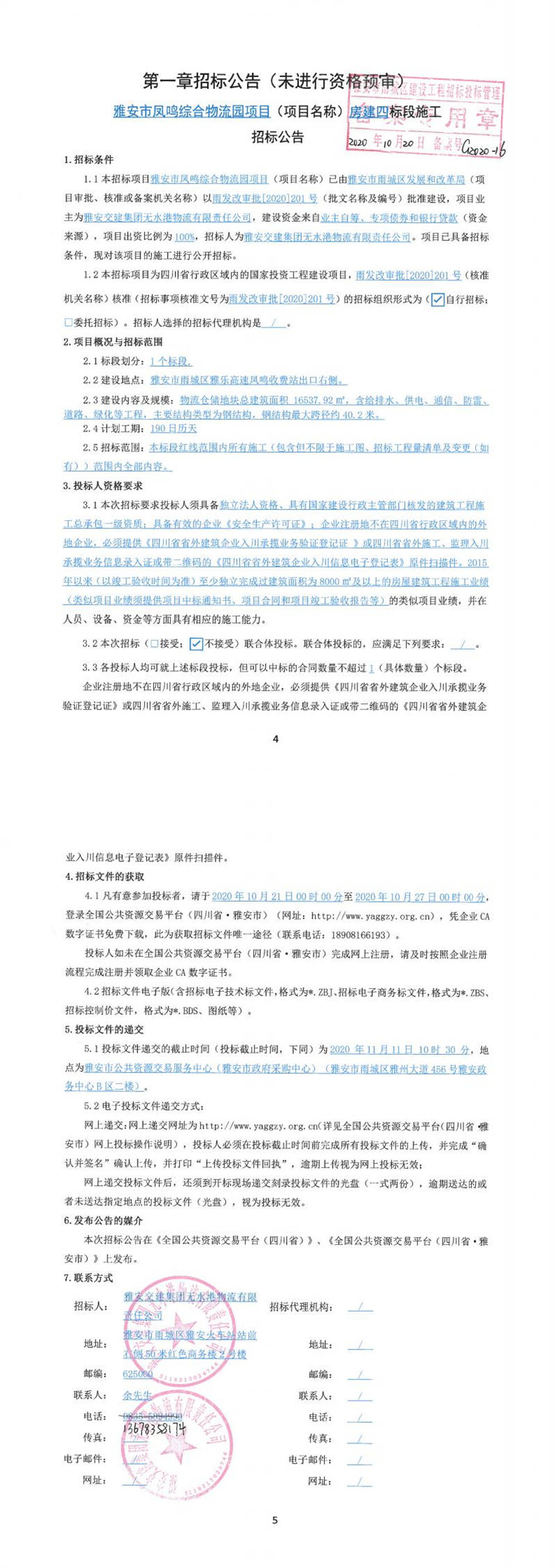 雅安交建集團(tuán)無(wú)水港物流有限責(zé)任公司雅安市鳳鳴綜合物流園項(xiàng)目(項(xiàng)目名稱(chēng))房建四標(biāo)段施工招標(biāo)公告