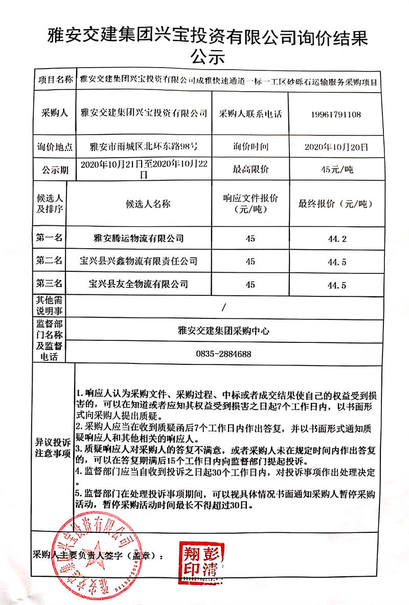 雅安交建集團興寶投資有限公司成雅快速通道一標一工區(qū)砂礫石運輸服務采購項目詢價結(jié)果公示