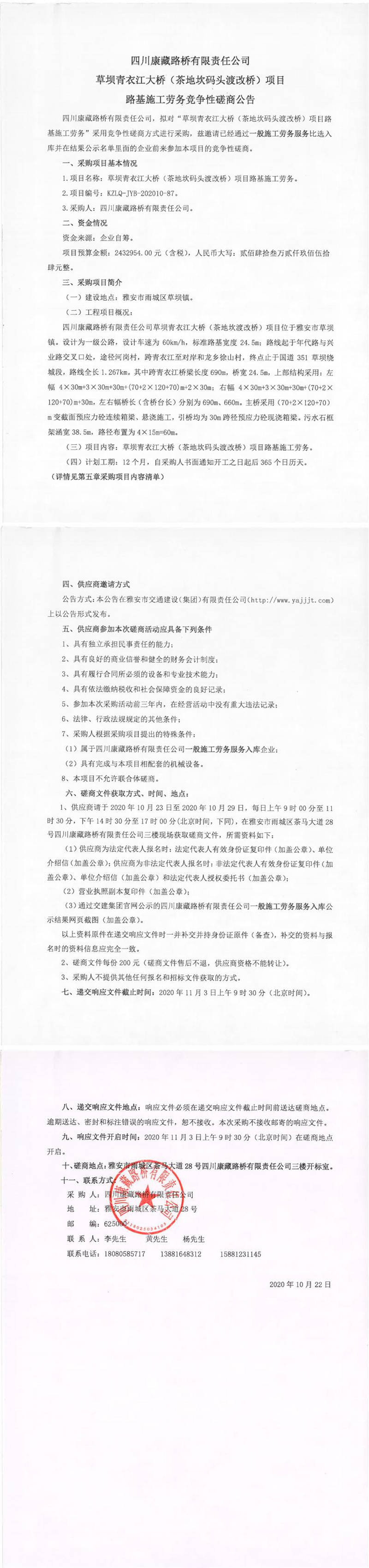 四川康藏路橋有限責任公司草壩青衣江大橋(茶地坎碼頭渡改橋)項目路基施工勞務(wù)競爭性磋商公告