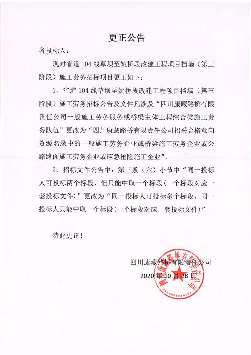 四川康藏路橋有限責(zé)任公司省道104線草壩至姚橋段改建工程項目擋墻(第三階段)施工勞務(wù)招標(biāo)項目更正公告