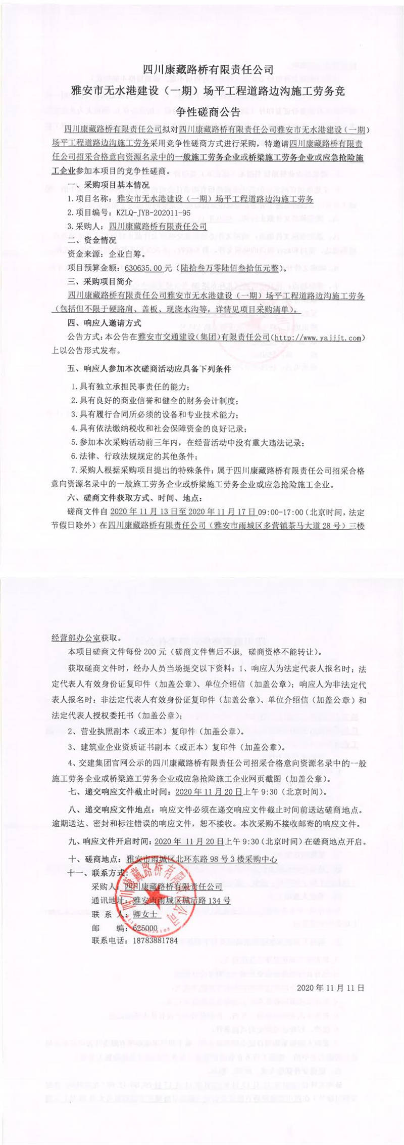 四川康藏路橋有限責(zé)任公司雅安市無水港建設(shè)(一期)場(chǎng)平工程道路邊溝施工勞務(wù)競(jìng)爭(zhēng)性磋商公告