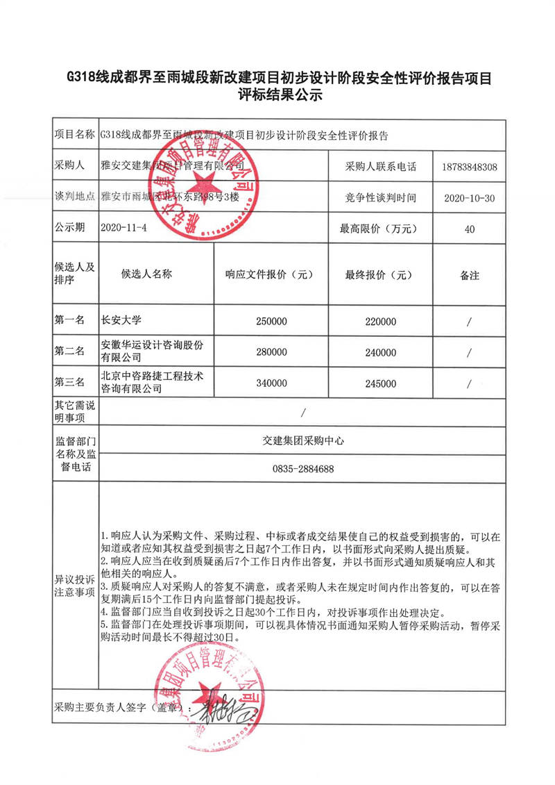 雅安交建集團項目管理有限公司G318線成都界至雨城段新改建項目初步設計階段安全性評價報告項目評標結果公示