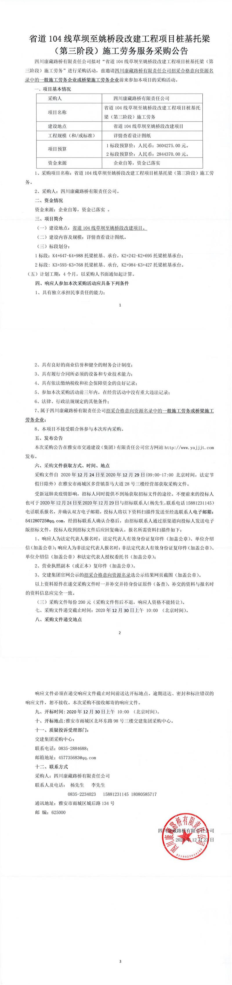 四川康藏路橋有限責(zé)任公司省道104線草壩至姚橋段改建工程項(xiàng)目樁基托梁(第三階段)施工勞務(wù)服務(wù)采購(gòu)公告