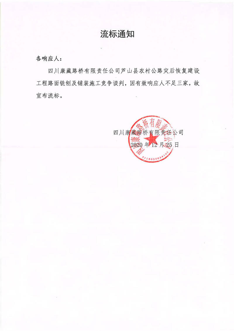 四川康藏路橋有限責任公司蘆山縣農(nóng)村公路災后恢復建設工程路面銑刨及鋪裝施工流標通知