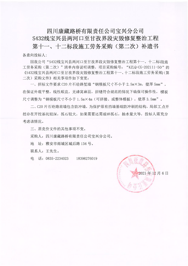 四川康藏路橋有限責(zé)任公司S432線寶興縣兩河口至甘孜界段災(zāi)毀修復(fù)整治工程第十一、十二標段施工勞務(wù)采購(第二次)補遺書