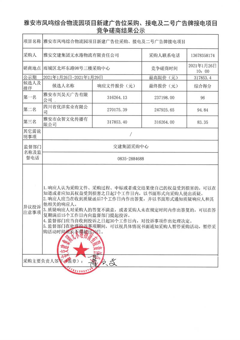 雅安交建集團無水港物流有限責任公司雅安市鳳鳴綜合物流園項目新建廣告位采購、接電及二號廣告牌接電項目競爭磋商結(jié)果公示