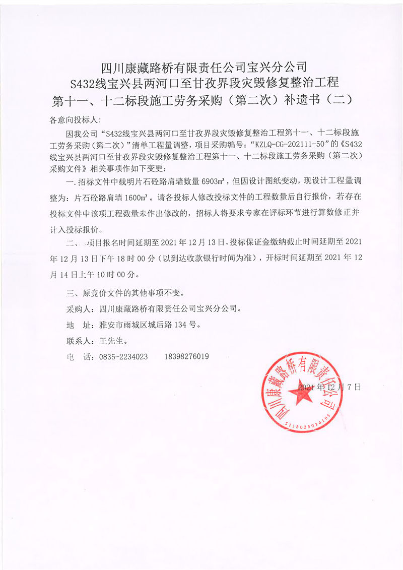 四川康藏路橋有限責任公司寶興分公司S432線寶興縣兩河口至甘孜界段災毀修復整治工程第十一、十二標段施工勞務采購(第二次)補遺書(二)