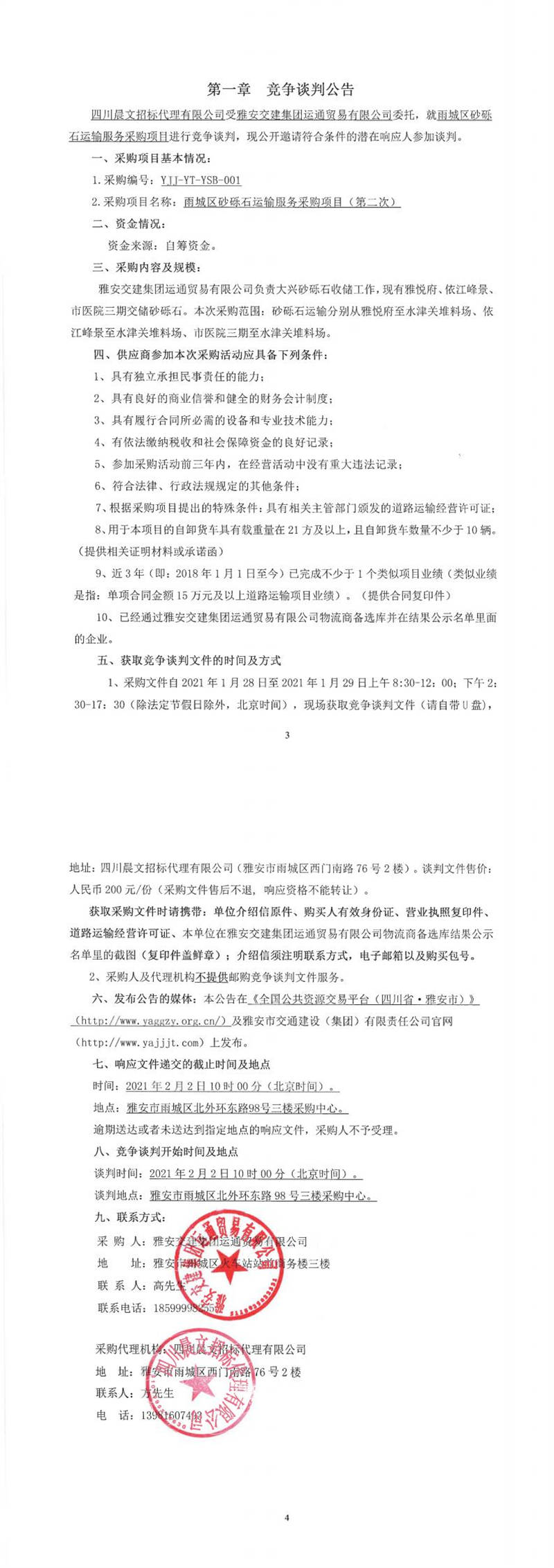 雅安交建集團(tuán)運(yùn)通貿(mào)易有限公司雨城區(qū)砂礫石運(yùn)輸服務(wù)采購項目(第二次)競爭談判公告
