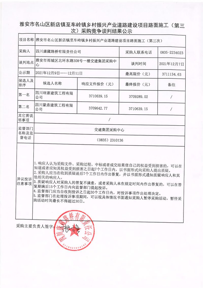 四川康藏路橋有限責任公司雅安市名山區(qū)新店鎮(zhèn)至車嶺鎮(zhèn)鄉(xiāng)村振興產業(yè)道路建設項目路面施工(第三次)采購競爭談判結果公示