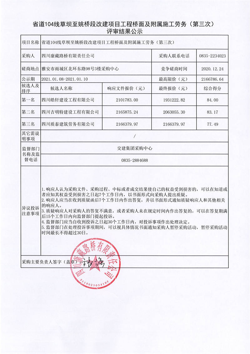 四川康藏路橋有限責任公司省道104線草壩至姚橋段改建項目工程橋面及附屬施工勞務(第三次)評審結(jié)果公示