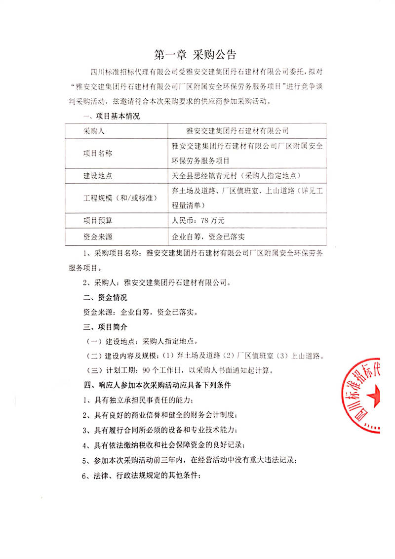 雅安交建集團丹石建材有限公司廠區(qū)附屬安全環(huán)保勞務(wù)服務(wù)項目競爭談判公告