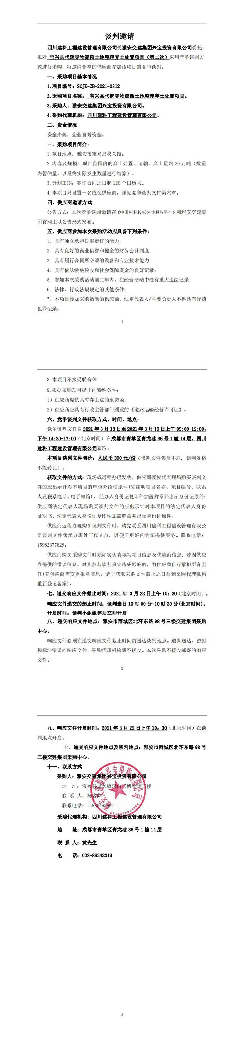 雅安交建集團(tuán)興寶投資有限公司寶興縣代碑寺物流園土地整理棄土處置項目(第二次)競爭談判公告