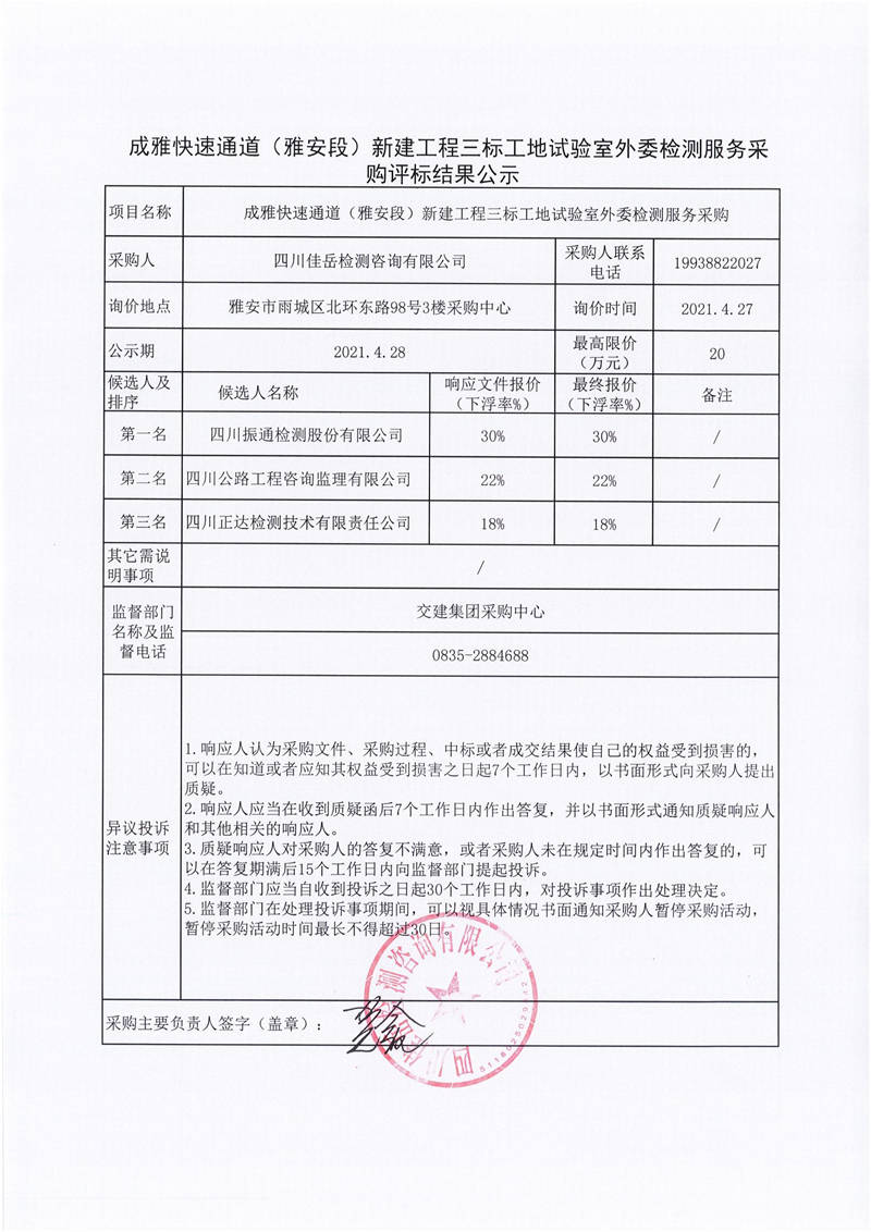 四川佳岳檢測咨詢有限公司成雅快速通道(雅安段)新建工程三標(biāo)工地試驗(yàn)室外委檢測服務(wù)采購評標(biāo)結(jié)果公示