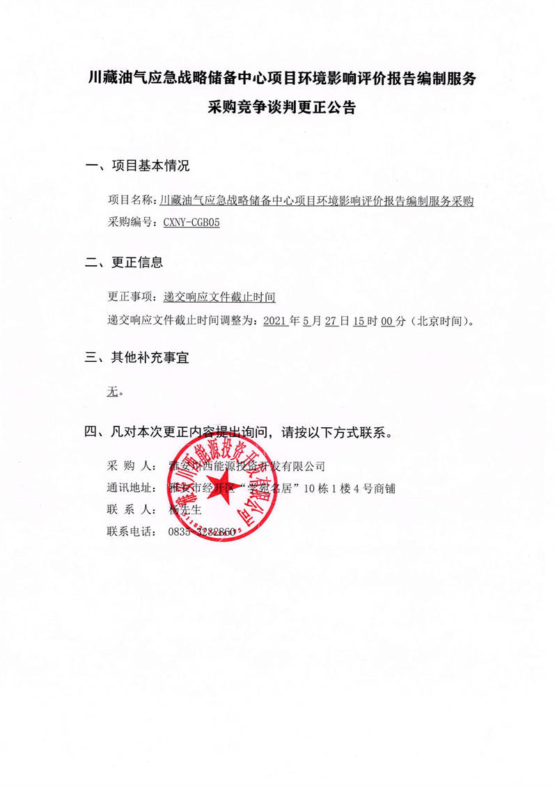 雅安川西能源投資開發(fā)有限公司川藏油氣應(yīng)急戰(zhàn)略儲(chǔ)備中心項(xiàng)目環(huán)境影響評(píng)價(jià)報(bào)告編制服務(wù)采購競(jìng)爭(zhēng)談判更正公告