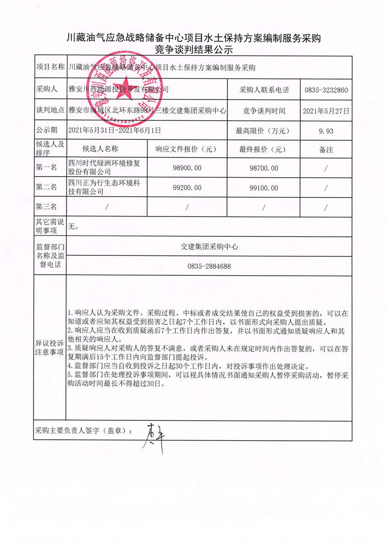 雅安川西能源投資開(kāi)發(fā)有限公司川藏油氣應(yīng)急戰(zhàn)略?xún)?chǔ)備中心項(xiàng)目水土保持方案編制服務(wù)采購(gòu)競(jìng)爭(zhēng)談判結(jié)果公示