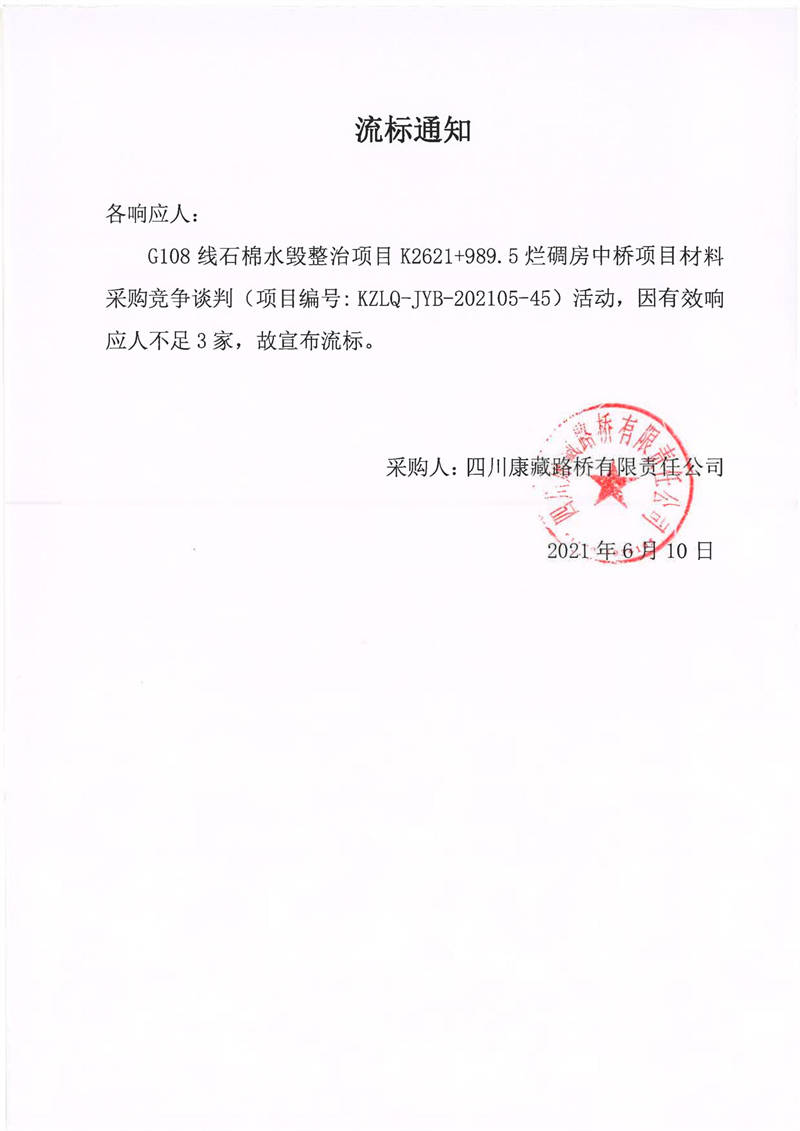 四川康藏路橋有限責(zé)任公司G108線石棉水毀整治項(xiàng)目K2621+989.5爛碉房中橋項(xiàng)目材料采購(gòu)競(jìng)爭(zhēng)談判流標(biāo)通知