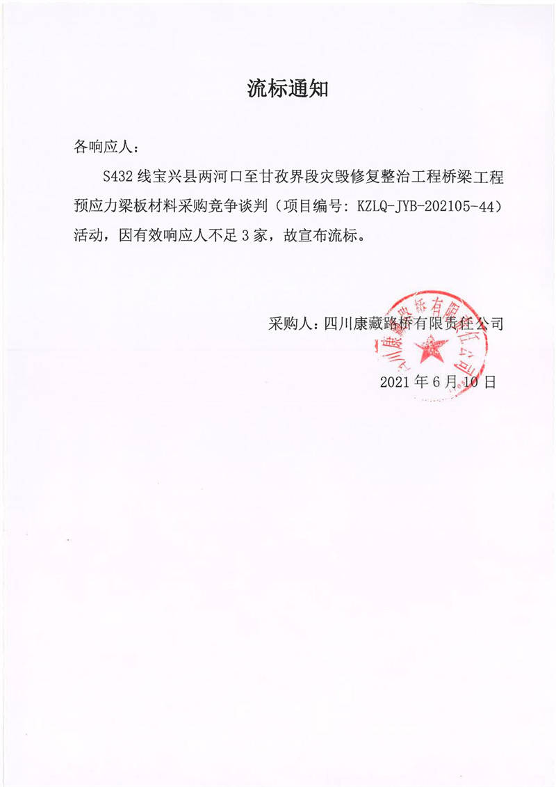 四川康藏路橋有限責任公司S432線寶興縣兩河口至甘孜界段災(zāi)毀修復(fù)整治工程橋梁工程預(yù)應(yīng)力梁板材料采購競爭談判流標通知