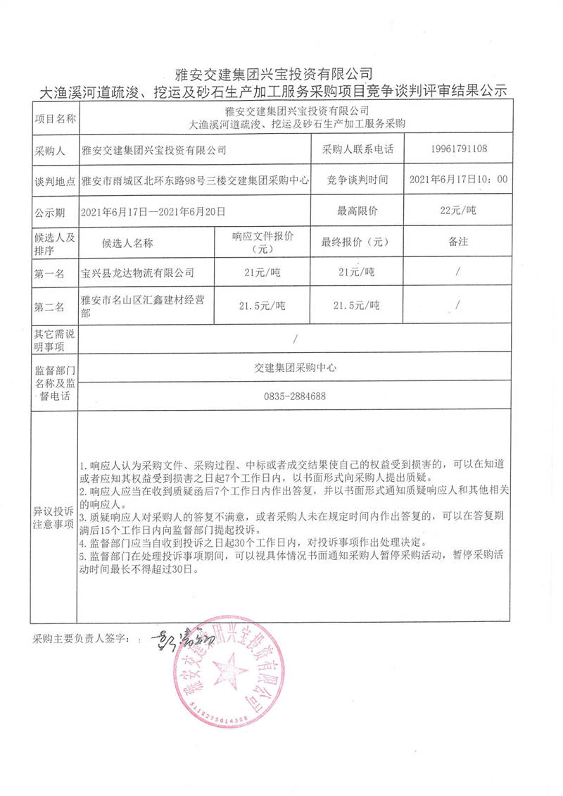 雅安交建集團(tuán)興寶投資有限公司大漁溪河道疏浚、挖運及砂石生產(chǎn)加工服務(wù)采購項目競爭談判評審結(jié)果公示