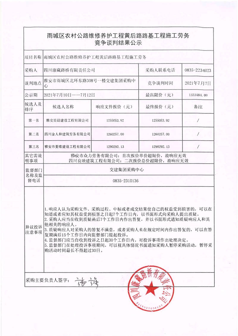 四川康藏路橋有限責任公司雨城區(qū)農(nóng)村公路維修養(yǎng)護工程黃后路路基工程施工勞務競爭談判結果公示