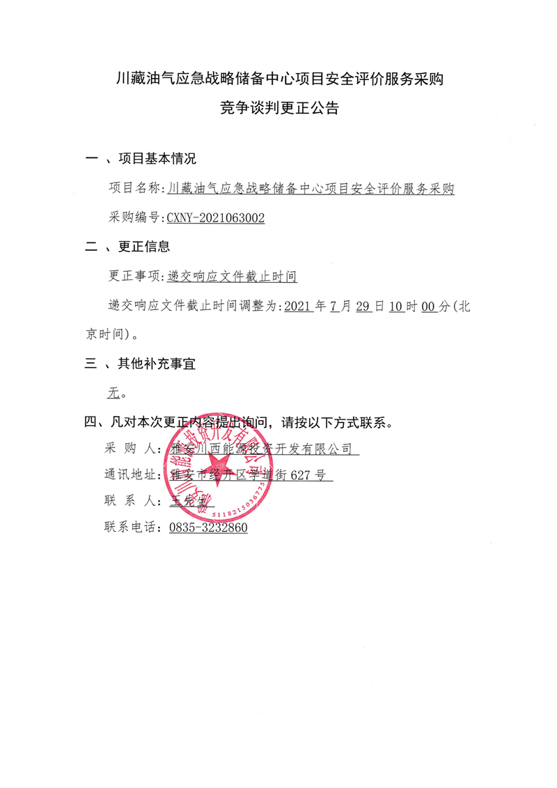 雅安川西能源投資開發(fā)有限公司川藏油氣應(yīng)急戰(zhàn)略儲備中心項(xiàng)目安全評價服務(wù)采購競爭談判更正公告