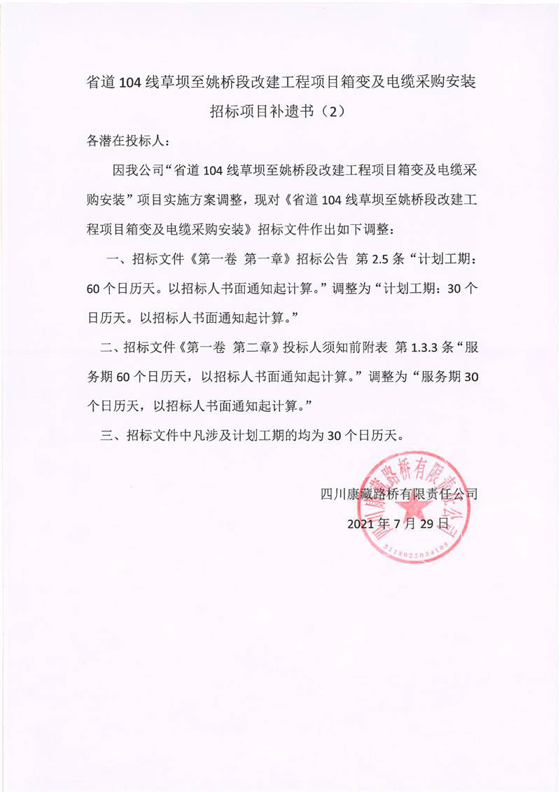 四川康藏路橋有限責(zé)任公司省道104線草壩至姚橋段改建項目箱變及電纜采購安裝招標(biāo)項目補遺書(2)