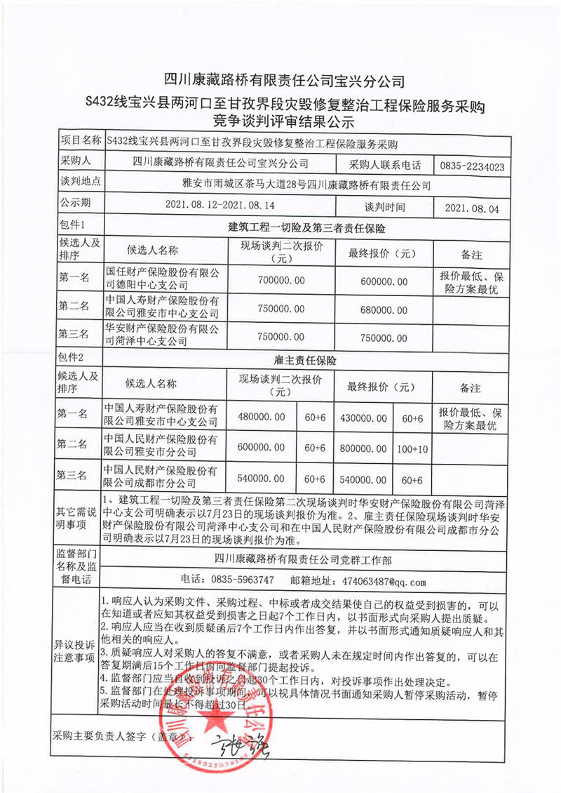 四川康藏路橋有限責(zé)任公司寶興分公司S432線寶興縣兩河口至甘孜界段災(zāi)毀修復(fù)整治工程保險(xiǎn)服務(wù)采購競(jìng)爭(zhēng)談判評(píng)審結(jié)果公示