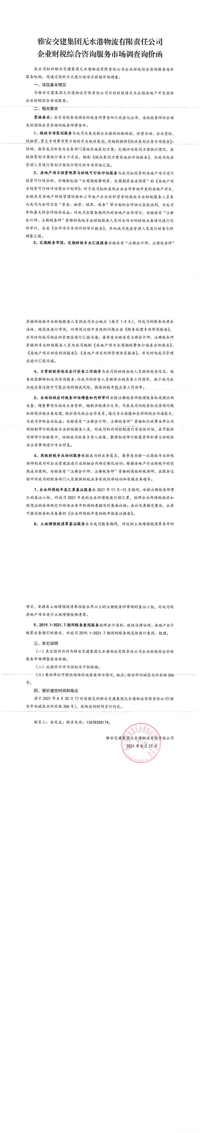 雅安交建集團(tuán)無水港物流有限責(zé)任公司企業(yè)財(cái)稅綜合咨詢服務(wù)市場(chǎng)調(diào)查詢價(jià)函