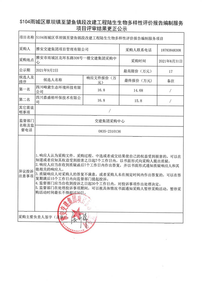 雅安交建集團(tuán)項(xiàng)目管理有限公司S104雨城區(qū)草壩鎮(zhèn)至望魚鎮(zhèn)段改建工程陸生生物多樣性評價(jià)報(bào)告編制服務(wù)項(xiàng)目評審結(jié)果更正公示