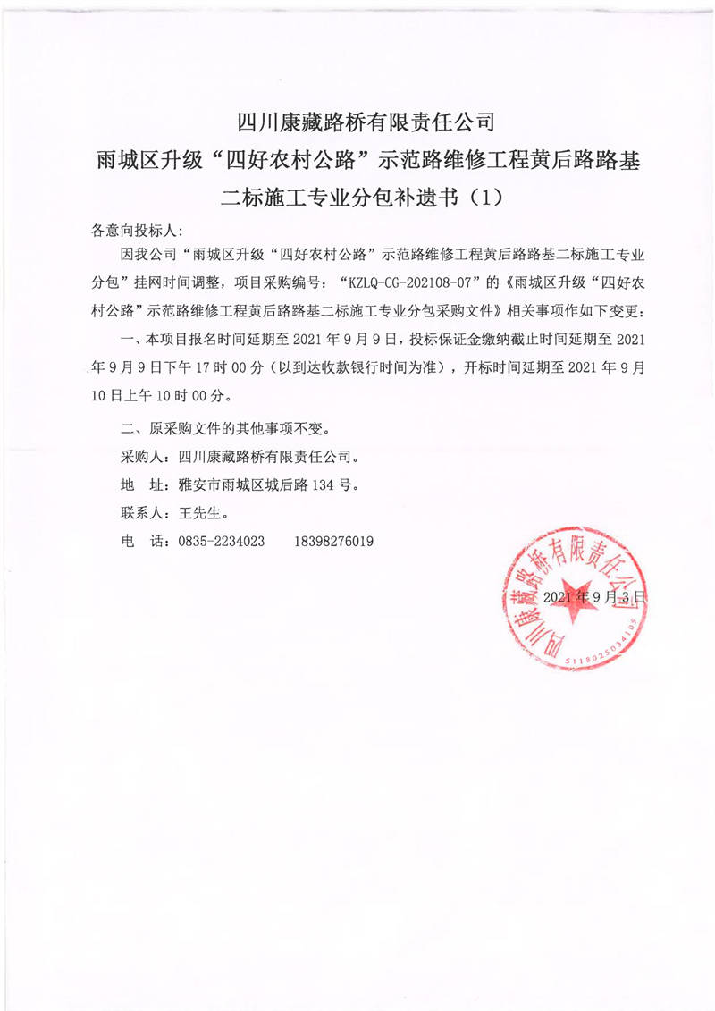 四川康藏路橋有限責(zé)任公司雨城區(qū)升級(jí)“四好農(nóng)材公路”示范路維修工程黃后路路基二標(biāo)施工專業(yè)分包補(bǔ)遺書(shū)(1)