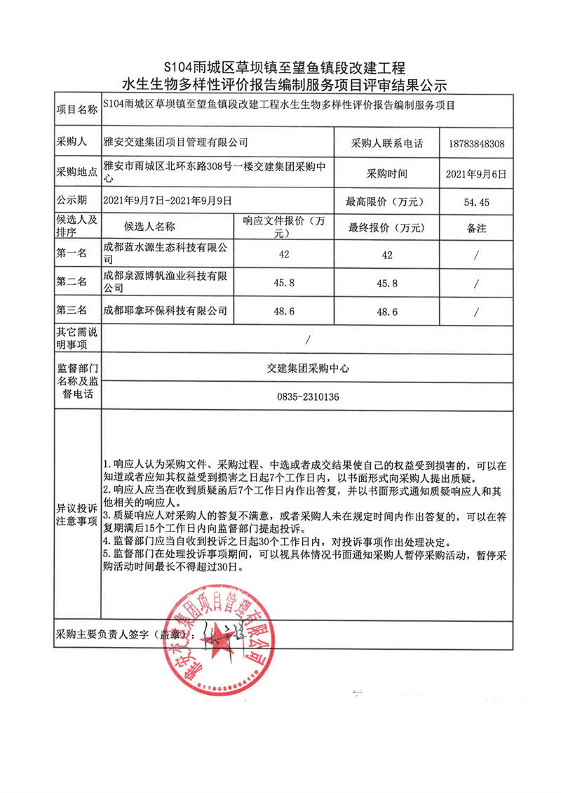 雅安交建集團項目管理有限公司S104雨城區(qū)草壩鎮(zhèn)至望魚鎮(zhèn)段改建工程水生生物多樣性評價報告編制服務項目評審結果公示