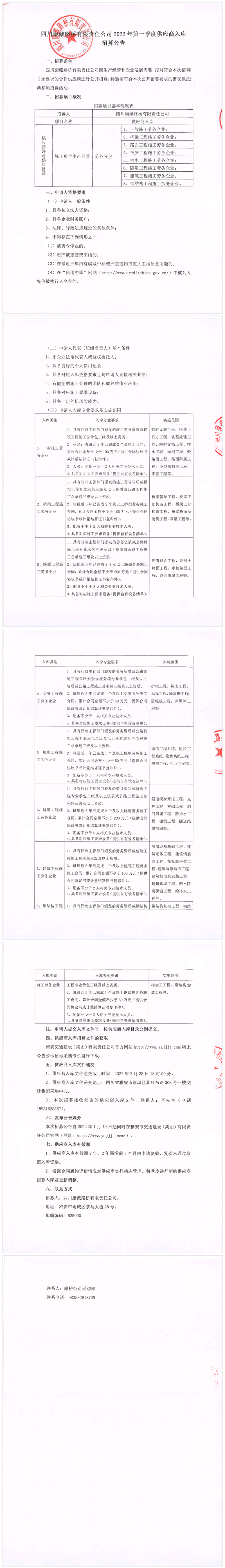 四川康藏路橋有限責任公司2022年第一季度供應商入庫招募公告
