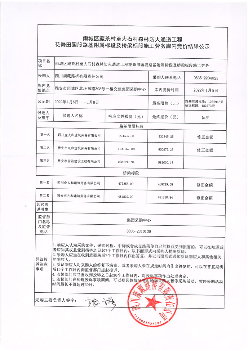 四川康藏路橋有限責(zé)任公司雨城雨城區(qū)藏茶村至大石村森林防火通道工程花舞田園段路基附屬標(biāo)段及橋梁標(biāo)段施工勞務(wù)庫內(nèi)競價(jià)結(jié)果公示