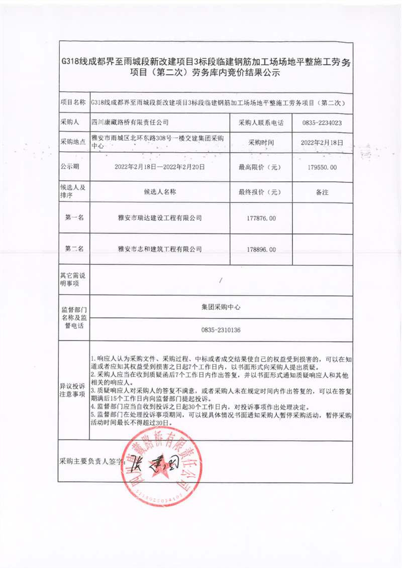 四川康藏路橋有限責任公司G318線成都界至雨城段新改建項目3標段臨建鋼筋加工場場地平整施工勞務(第二次)庫內競價結果公示