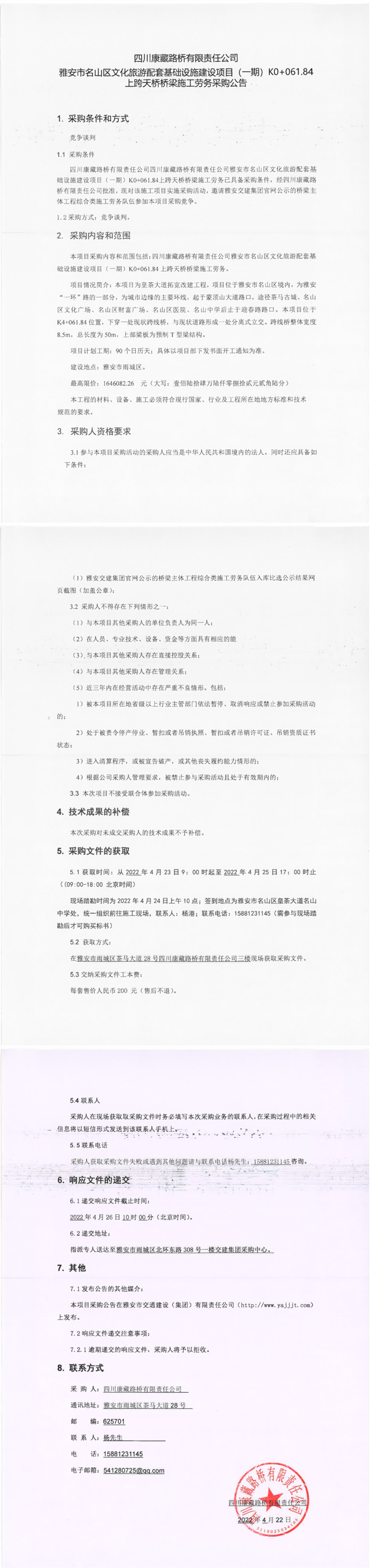 四川康藏路橋有限責任公司雅安市名山區(qū)文化旅游配套基礎(chǔ)設(shè)施建設(shè)項目(一期)K0+061.84上跨天橋橋梁施工勞務采購公告