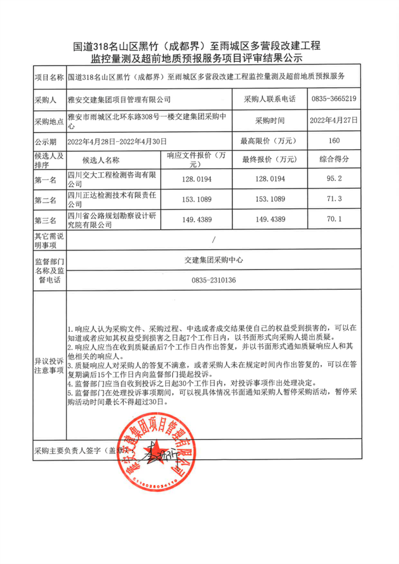 雅安交建集團項目管理有限公司國道318名山區(qū)黑竹(成都界)至雨城區(qū)多營段改建工程監(jiān)控量測及超前地質(zhì)預(yù)報服務(wù)項目評審結(jié)果公示