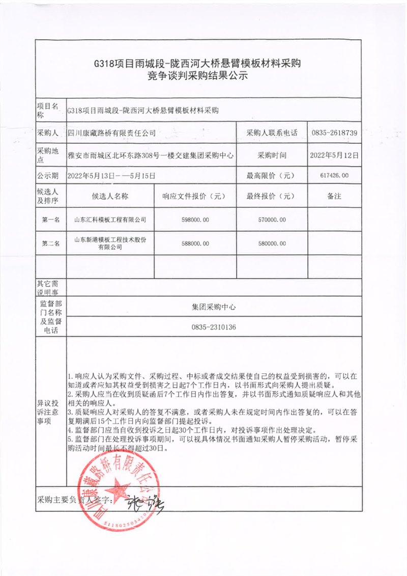 四川康藏路橋有限責(zé)任公司G318項(xiàng)目雨城段-隴西河大橋懸臂模板材料采購競爭談判采購結(jié)果公示