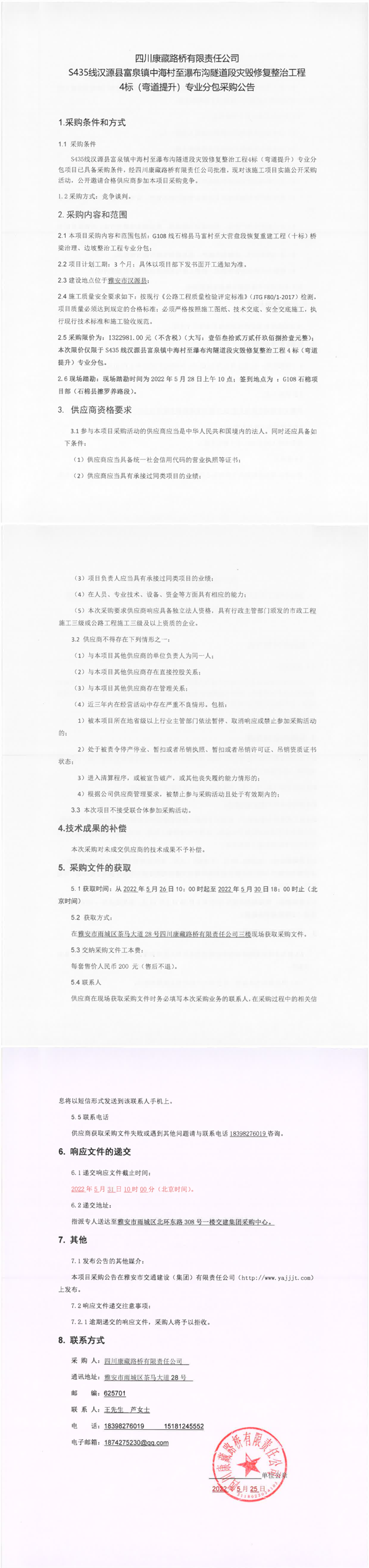 四川康藏路橋有限責(zé)任公司S435線漢源縣富泉鎮(zhèn)中海村至瀑布溝隧道段災(zāi)毀修復(fù)整治工程4標(biāo)(彎道提升)專(zhuān)業(yè)分包采購(gòu)公告