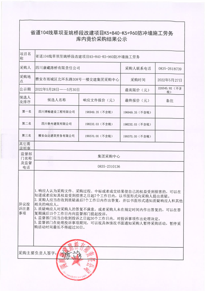 四川康藏路橋有限責(zé)任公司省道104線草壩至姚橋段改建項(xiàng)目K5+840-K5+960防沖墻施工勞務(wù)庫內(nèi)競價(jià)采購結(jié)果公示