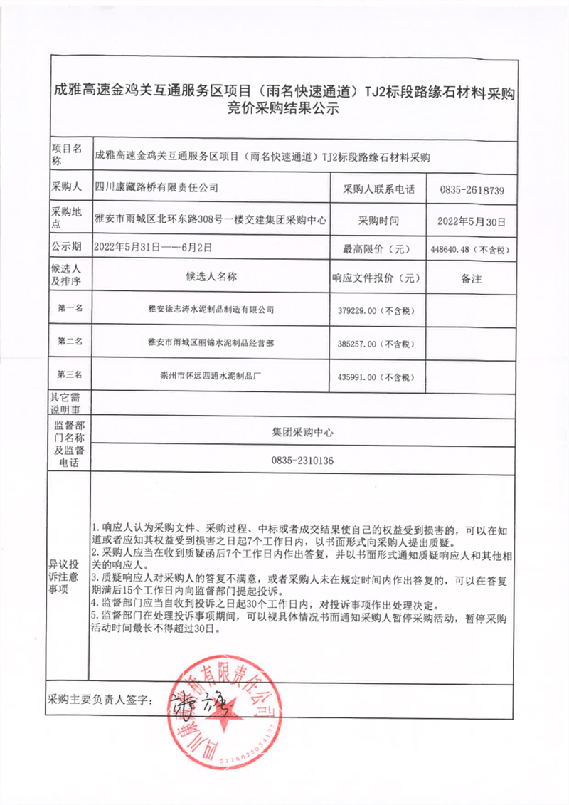 四川康藏路橋有限責(zé)任公司成雅高速金雞關(guān)互通服務(wù)區(qū)項目(雨名快速通道)TJ2標(biāo)段路緣石材料采購競價采購結(jié)果公示