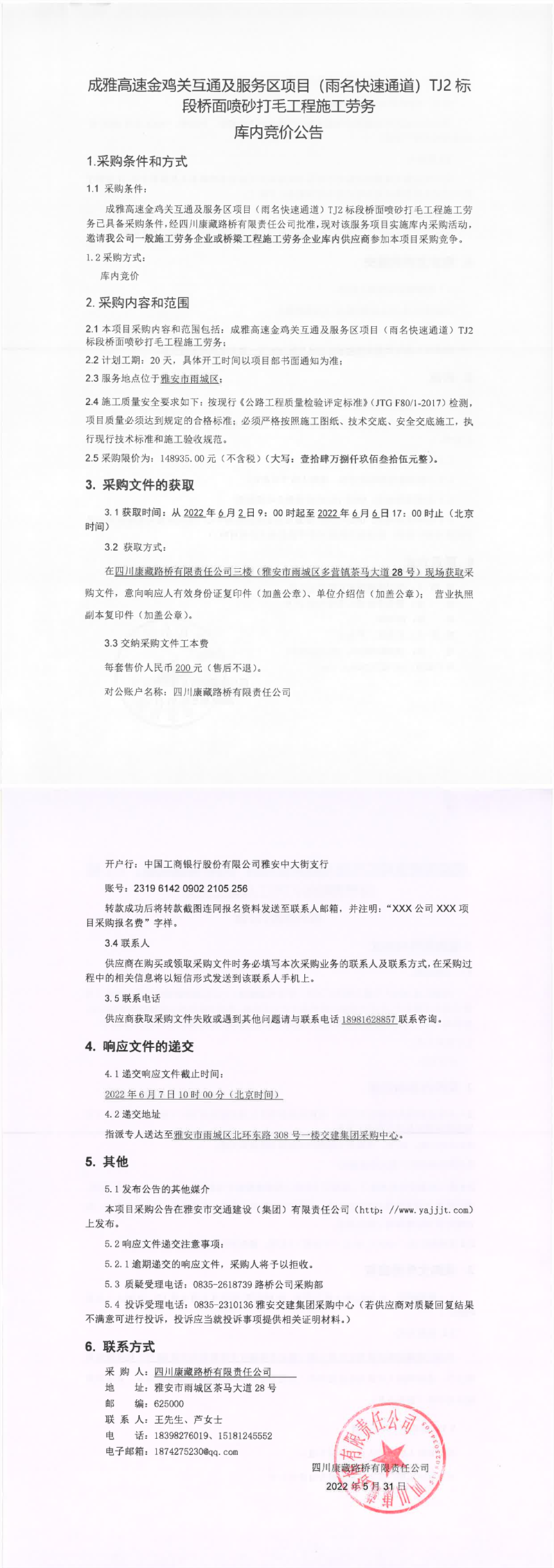 四川康藏路橋有限責任公司成雅高速金雞關互通及服務區(qū)項目(雨名快速通道)TJ2標段橋面噴砂打毛工程施工勞務庫內(nèi)競價公告