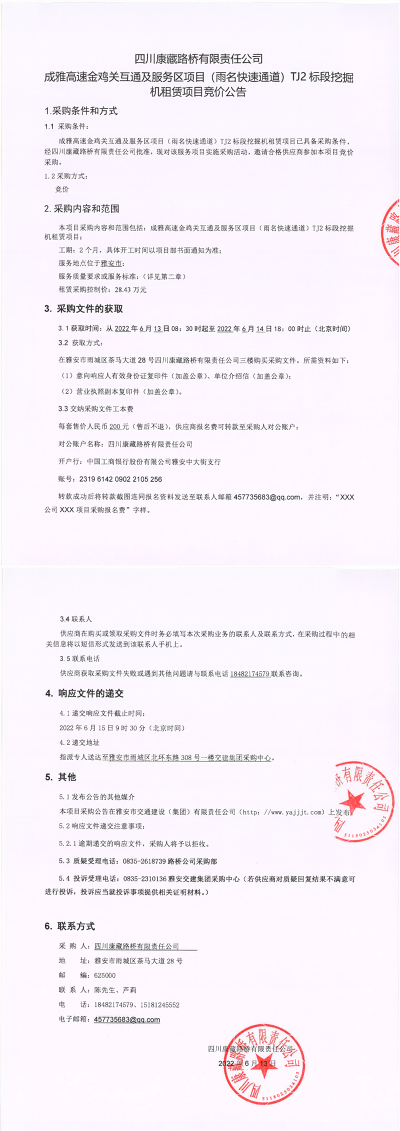 四川康藏路橋有限責(zé)任公司成雅高速金雞關(guān)互通及服務(wù)區(qū)項目(雨名快速通道)TJ2標(biāo)段挖掘機租賃項目競價公告