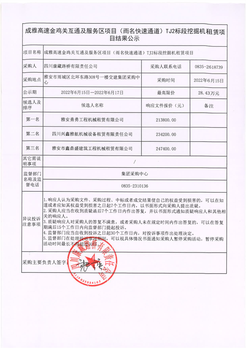 四川康藏路橋有限責任公司成雅高速金雞關互通及服務區(qū)項目(雨名快速通道)TJ2標段挖掘機租賃項目結果公示
