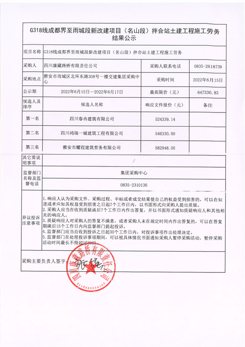 四川康藏路橋有限責任公司G318線成都界至雨城段新改建項目(名山段)拌合站土建工程施工勞務結果公示