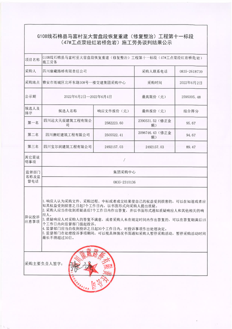 四川康藏路橋有限責任公司G108線石棉縣馬富村至大營盤段恢復(fù)重建(修復(fù)整治)工程第十一標段(47#工點滎經(jīng)紅巖橋危巖)施工勞務(wù)談判結(jié)果公示