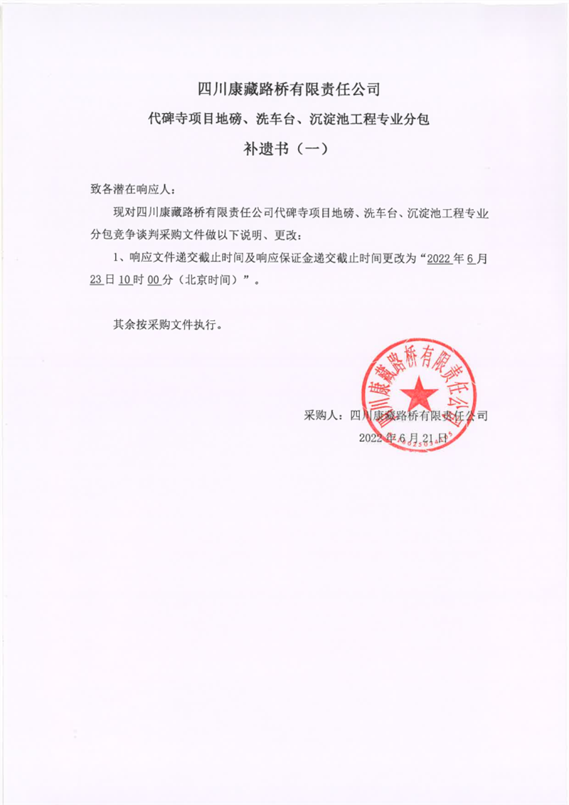 四川康藏路橋有限責(zé)任公司代碑寺項(xiàng)目地磅、洗車(chē)臺(tái)、沉淀池工程專(zhuān)業(yè)分包補(bǔ)遺書(shū)(一)