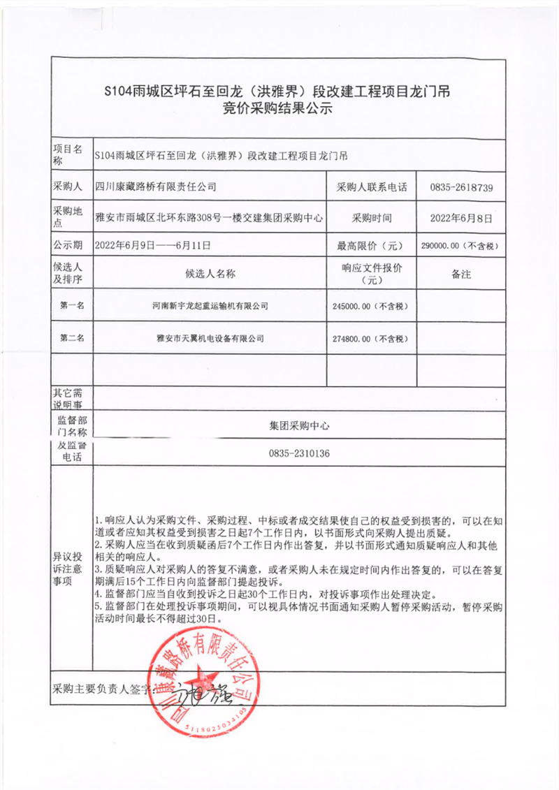 四川康藏路橋有限責(zé)任公司S104雨城區(qū)坪石至回龍(洪雅界)段改建工程項目龍門吊競價采購結(jié)果公示