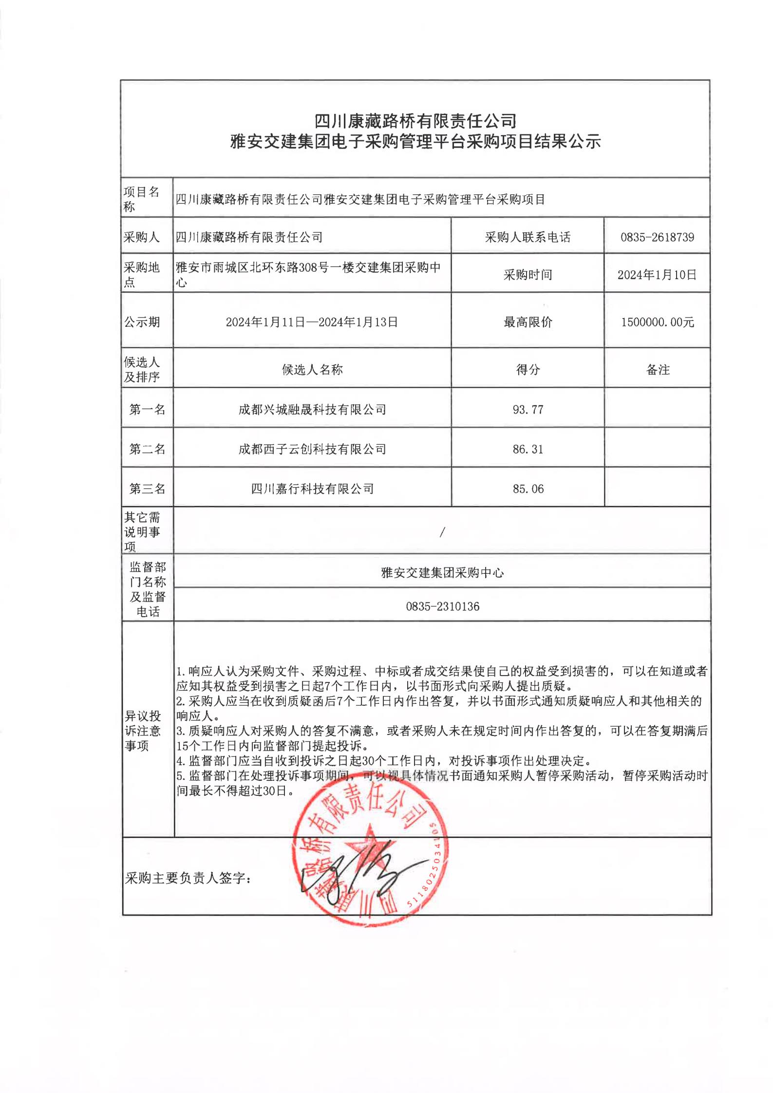 四川康藏路橋有限責任公司雅安交建集團電子采購管理平臺采購項目結果公示