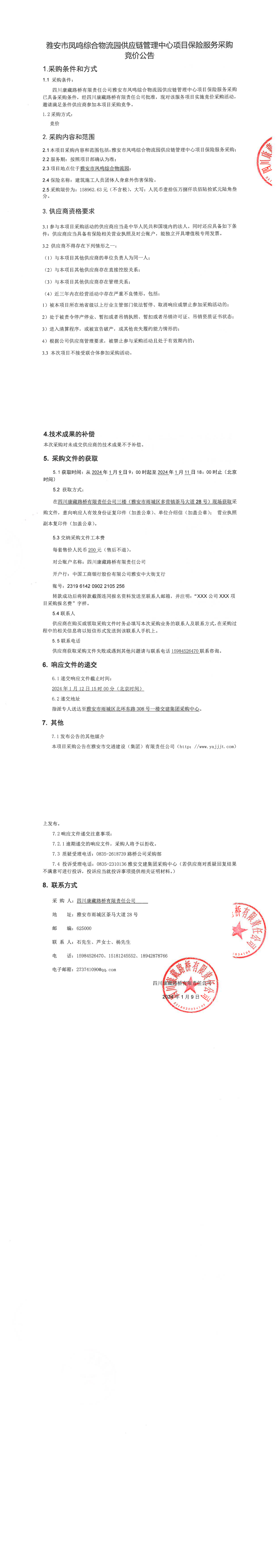 四川康藏路橋有限責(zé)任公司雅安鳳鳴綜合物流園供應(yīng)鏈管理中心項目保險服務(wù)采購競價公告