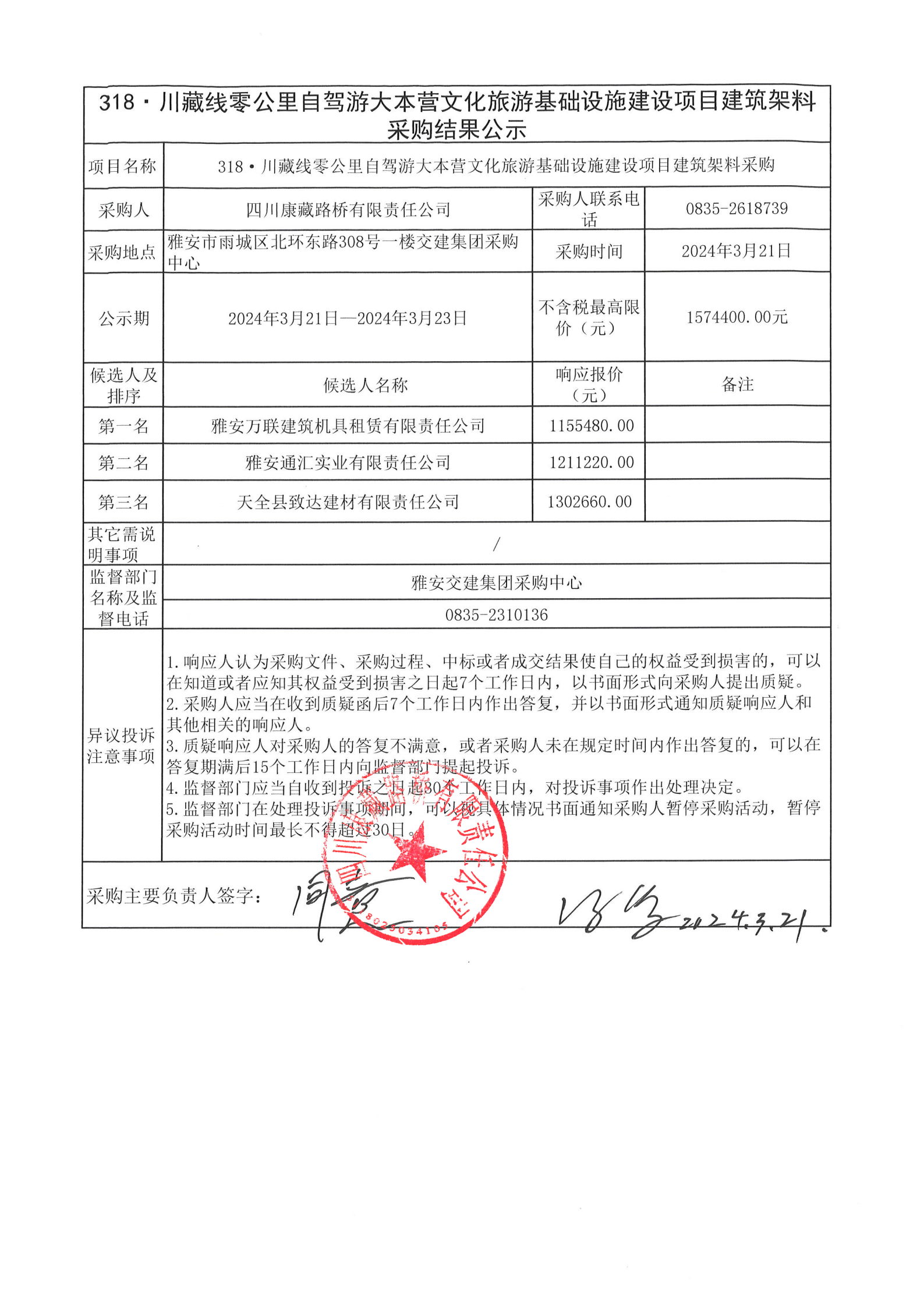 四川康藏路橋有限責任公司318·川藏線零公里自駕游大本營文化旅游基礎(chǔ)設施建設項目建筑架料租賃采購結(jié)果公示